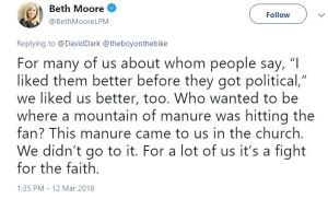 That said, I’ve also been thinking of the wider issues surrounding Beth Moore’s decision to delete the biblical discussion of homosexuality from her book. It’s bad enough to be ashamed of God’s doctrine to delete it completely from your book. But this next part compounds the wrong.