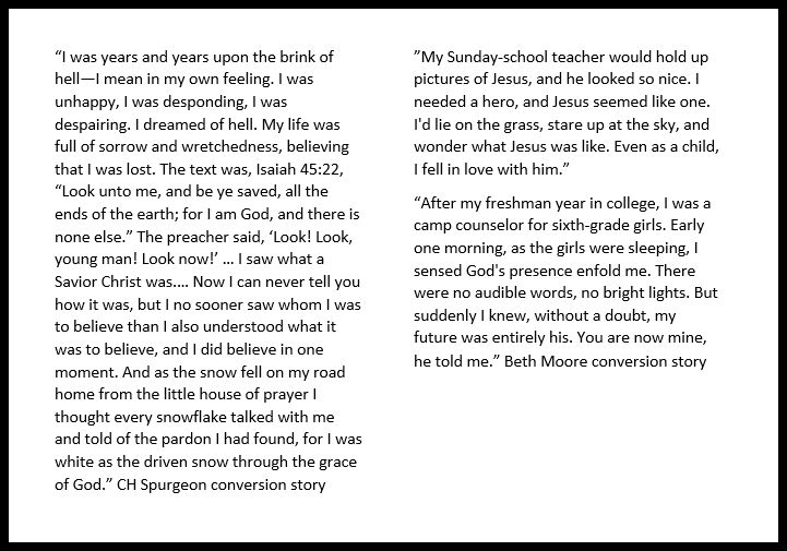 See below the conversion story of a 16 year old Charles Spurgeon, compared to the 18 year old Beth Moore conversion story. House of sand indeed.