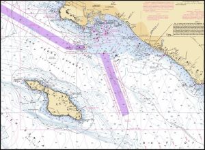 When I sailed on the ocean, we were guided in navigation by a nautical chart. Cargo ships, cruise ships, pleasure boats…all adhered to the rules of the road. This what it’s actually called, the rules of the road. The chart lays out the comings and goings of ships so they won’t crash into each other, especially as they near the busy port. They are called shipping lanes. Every mark on the chart means something and ships obey them if they don’t want to crash. It’s all highly managed. It looks like this: