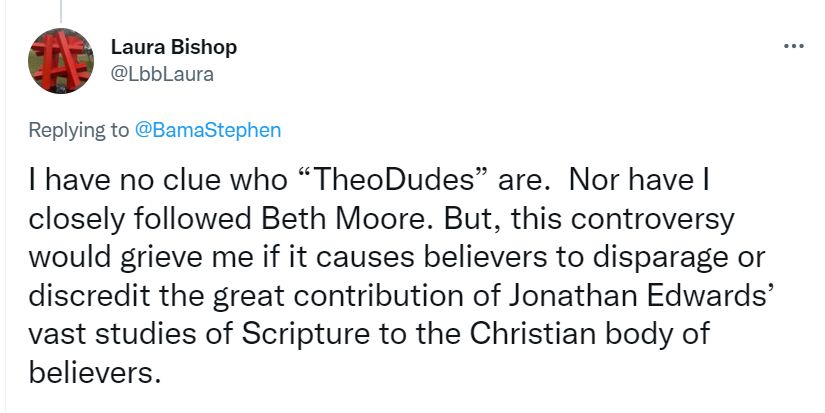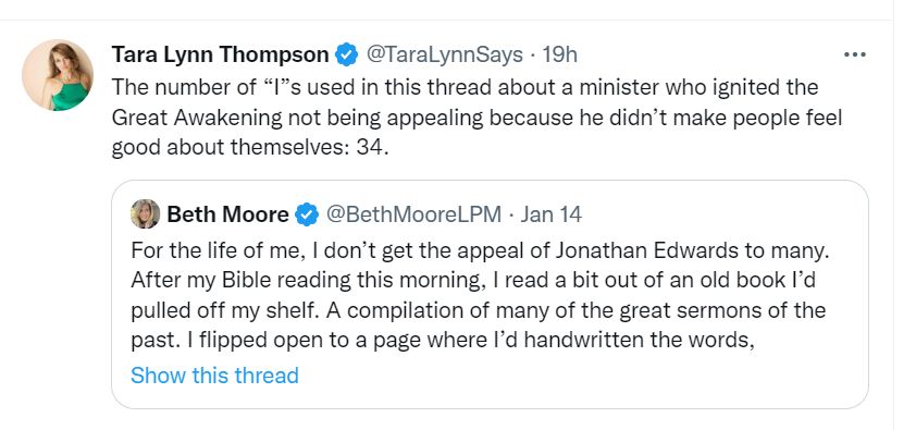 @MichelleDLesley: “Posting a tweet that caused bunches of people to Google and read “Sinners in the Hands of an Angry God” is probably the greatest gospel impact Beth Moore has ever had.”