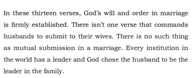 Her version of submission is one way only and she doesn’t to my knowledge teach young women what to expect from a husband according to Ephesians 5 or any other pertinent verses.