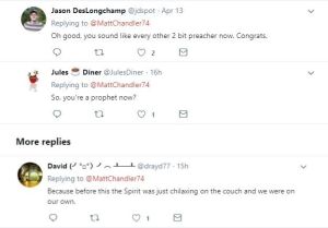 Discernment is important. Please wisely listen to your discernment people and compare what they are saying to scripture. As for Mr Chandler, it breaks my heart, absolutely and totally, when this happens. The elders said the messaging wasn’t sexual but included “coarse joking.” That sounds sexual to me. I feel for Lauren, I feel for their church. It is a sad, sad, state of affairs for all involved.