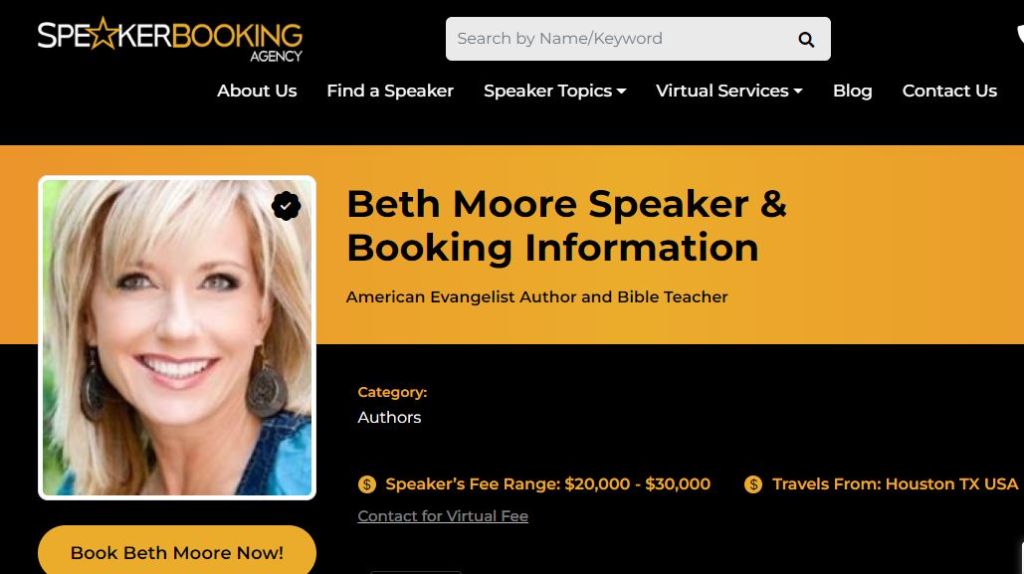 PS- Beth Moore is preaching again this Sunday, at Transformation Church. PPS: Her speaking fees range from $20,000 – $30,000 per.