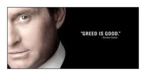 The movie Wall Street came out in 1987. The 80s were a heady time of pell-mell stock surges, whirling real estate flips, dizzying income heights…it seemed that nothing was impossible and money would last forever. In that atmosphere came the movie Wall Street, in which financier and stock raider Michael Douglas’s character Gordon Gecko famously gave his ‘greed is good’ speech. Here it is in part: