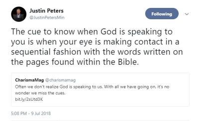 So, no, Jesus is not calling or talking or teaching or delivering new revelations or meeting you with dates or smiling in a silent whisper. As the noted preacher and discernment lecturer, author of the excellent lesson Clouds Without Water, Justin Peters said,